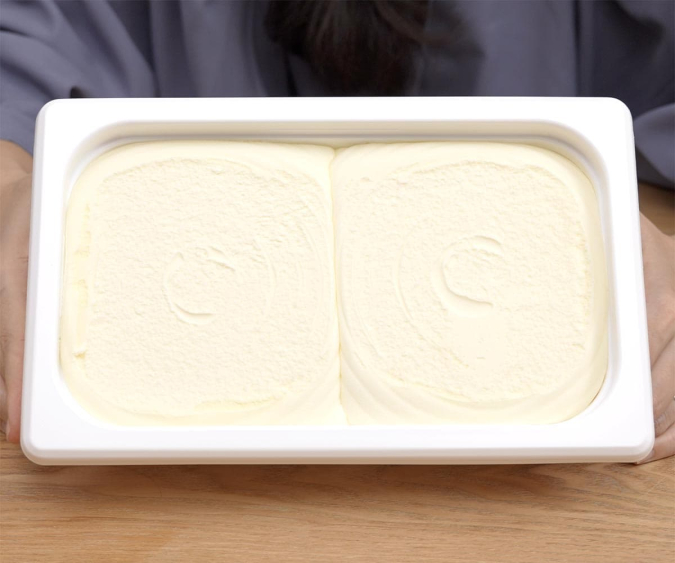 蓋を開けたらクリーム色のアイスが1L分ずつ2つ、みっちり詰まっています。
