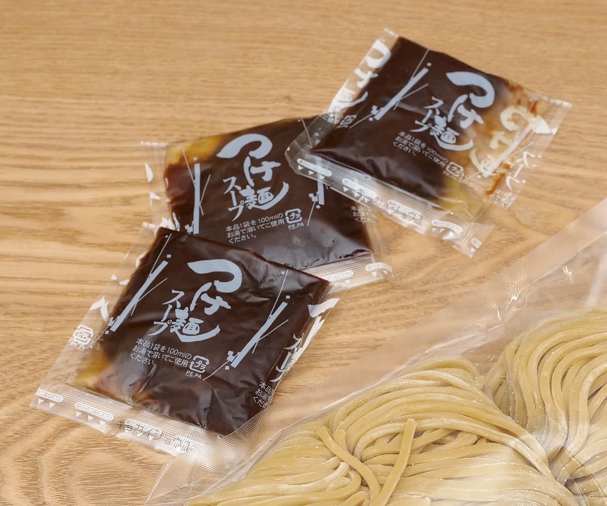 まずご紹介するのは、チルドコーナーで販売されている『岡崎製麺 用宗の老舗製麺所で造ったつけ麺』(998円)。しらす漁で有名な港町・静岡市駿河区用宗(もちむね)の老舗製麺工場『岡崎製麺』によるインスタントタイプの「つけ麺」。太く黄色いストレート麺と、希釈タイプの魚介醤油スープがそれぞれ6食分(3食×2袋)入っています。