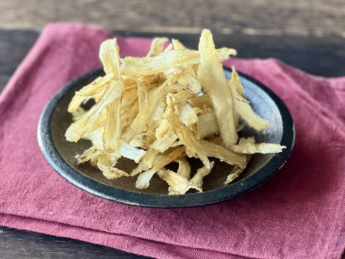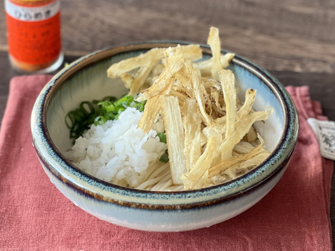 素揚げのごぼうもおいしいですが、薄衣をつけるとさらにサクッと軽やかな感じが出ます。これからの季節はぶっかけうどんやそばなどのトッピングにもぜひ。