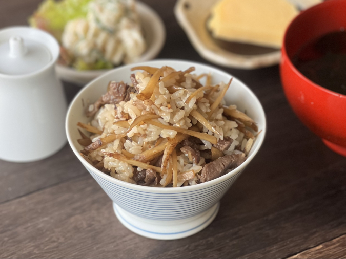 1:混ぜるだけで味しみうまうま!「牛ごぼうごはん」