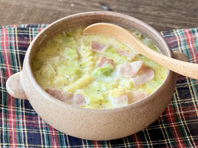 2:早ゆでペンネでボリュームアップ「キャベツとベーコンのミルクスープ」
