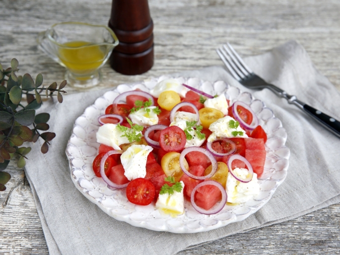 スイカのほどよい甘さとトマトのフルーティーさ、そしてミルキーなモッツァレラチーズのコクが合わさった、とってもおいしいサラダ。爽やかな味わいで、これからの季節にもピッタリです。