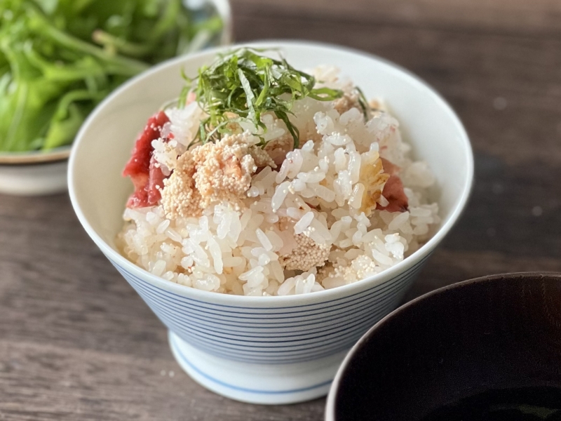 だしなどを加えなくても、めんたいこの旨味も加わっておいしく炊きあがりますよ。