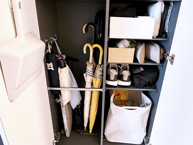 玄関に傘立てを置いている方も多いと思いますが、おすすめは靴箱の中に収納すること。玄関がすっきり使いやすく、掃除がしやすくなるからです。