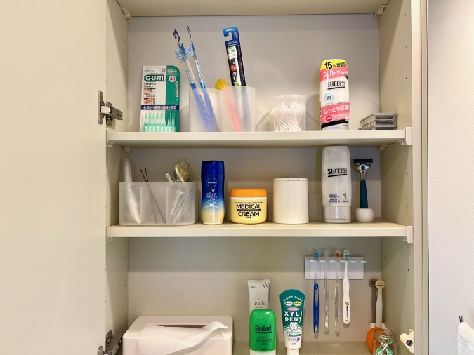 棚にピッタリ合うサイズのボックスを探して並べて、歯ブラシや歯磨き粉などの洗面用品のストックなどを収納していました。