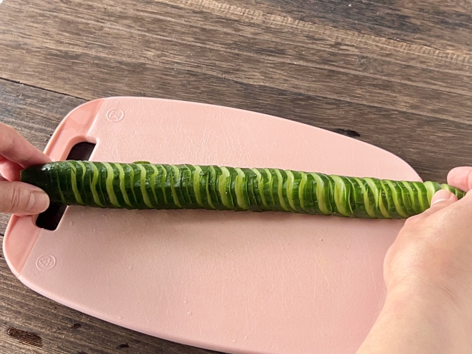 (1)きゅうりの両端のへたを切り落とし、菜箸をきゅうりの上下に置く。包丁が菜箸に当たるまで、斜めに細かく切り込みを入れる。裏返して、反対側も同様に切り込みを入れる。