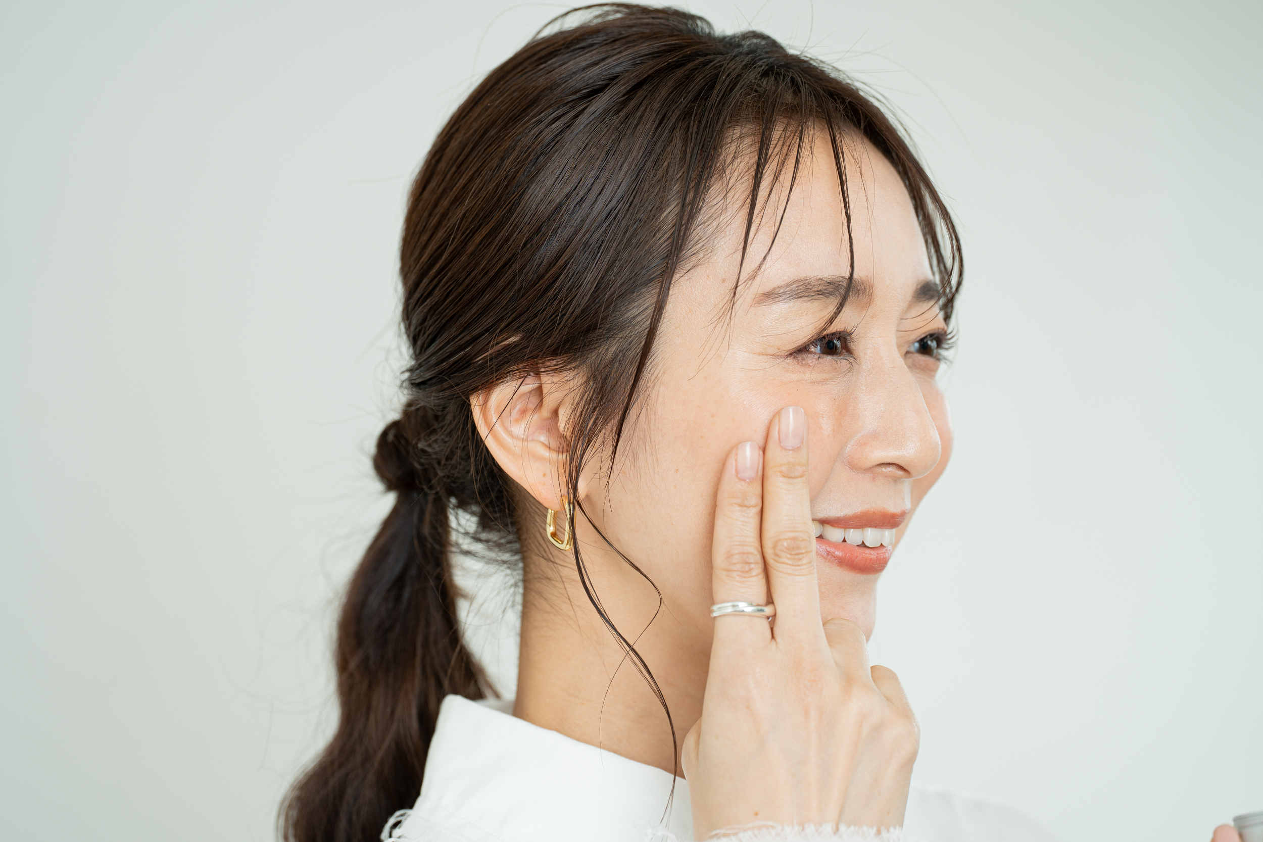 肌の上を滑らせるように横に塗るのではなく、ぽんぽんと軽く触るだけ。時間が経ってもヨレない、密着度の高い仕上がりが叶います。「触れるか触れないか」の優しいタッチが、バーム本来の美しい色とツヤをのせるコツです。