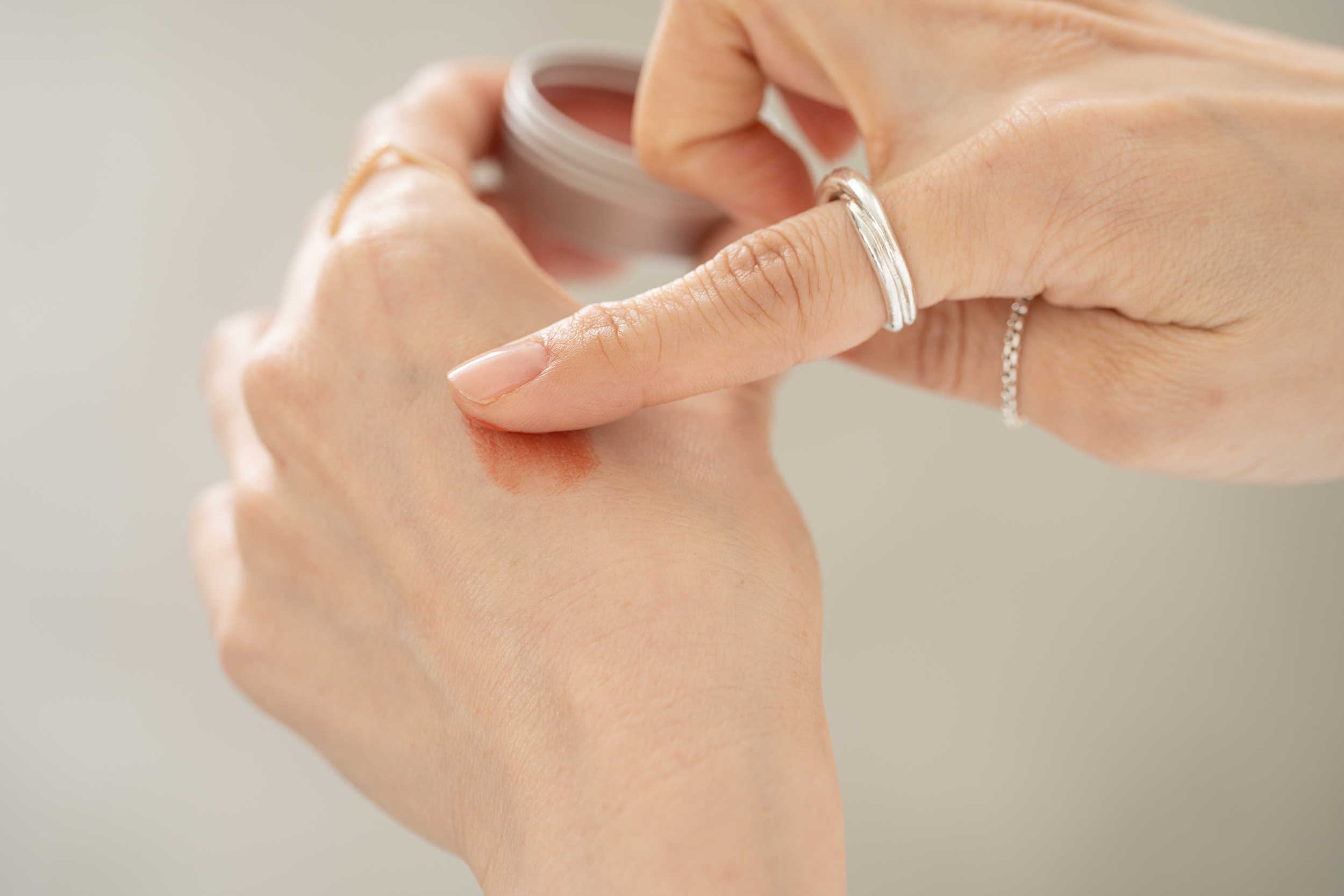 バームを指にとったら、いきなり肌にのせないこと。まずは手の甲をキャンバスのように使うイメージでトントンとなじませ、指先への付き具合を均一に調整にし、色味を確認します。このひと手間で、ムラやのせすぎを防ぎ、まるでプロのような自然な仕上がりが叶います。